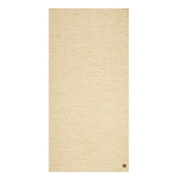 Gåsöga från KM Carpets, handvävd matta i ull- och bomullsmix med ett gåsögemönster som går i två färger - ett ljus gulmelerat garn blandas med ett naturvitt garn som tillsammans utgör det rutiga mönstret.