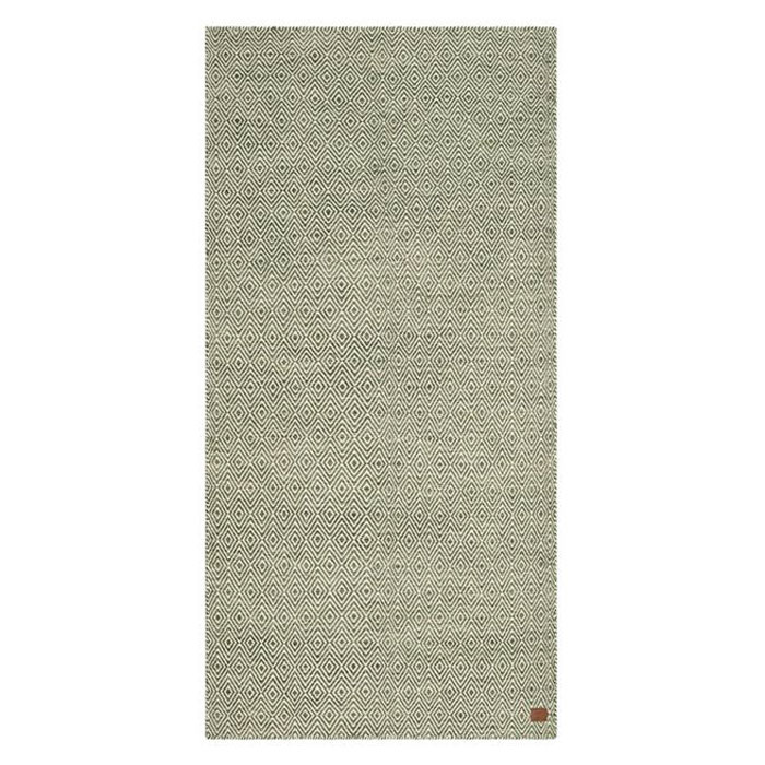 Gåsöga från KM Carpets, handvävd matta i ull- och bomullsmix med ett gåsögemönster som går i två färger - ett grönmelerat garn blandas med ett naturvitt garn som utgör det rutiga mönstret.