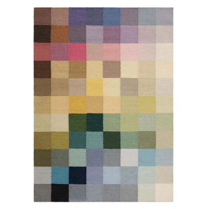 Riviera Kon från KM Carpets, handvävd ullmatta där ett mönster av kvadrater i olika färger skapar en härlig färgklick i ditt hem.