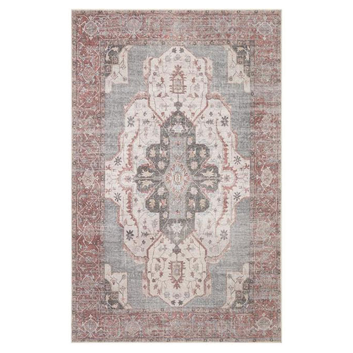 Exklusiv chenille-matta från KM Carpets med ett orientaliskt inspirerat mönster på en cremefärgad bas med en tydlig medaljong i mitten. Mönstret är snyggt inramat av en dovt röd bård, med detaljer som går i creme och ljust blått.