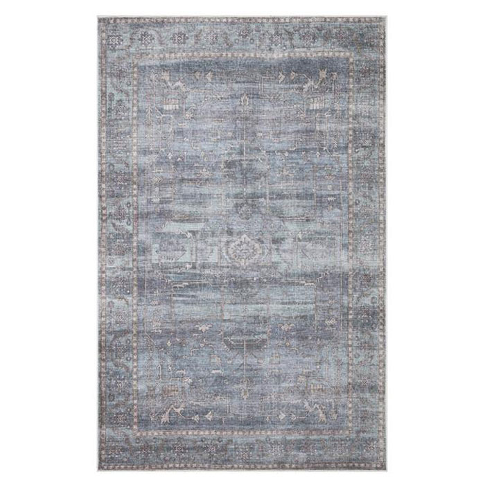 Exklusiv, blå chenille-matta från KM Carpets med ett diskret orientaliskt inspirerat mönster. Mattans basfärg uppfattas som lätt melerad då de blå tonerna skiftar i styrka. Runt mattan löper en svag bård med olika grå toner som ger mönstret en fin kontrast.