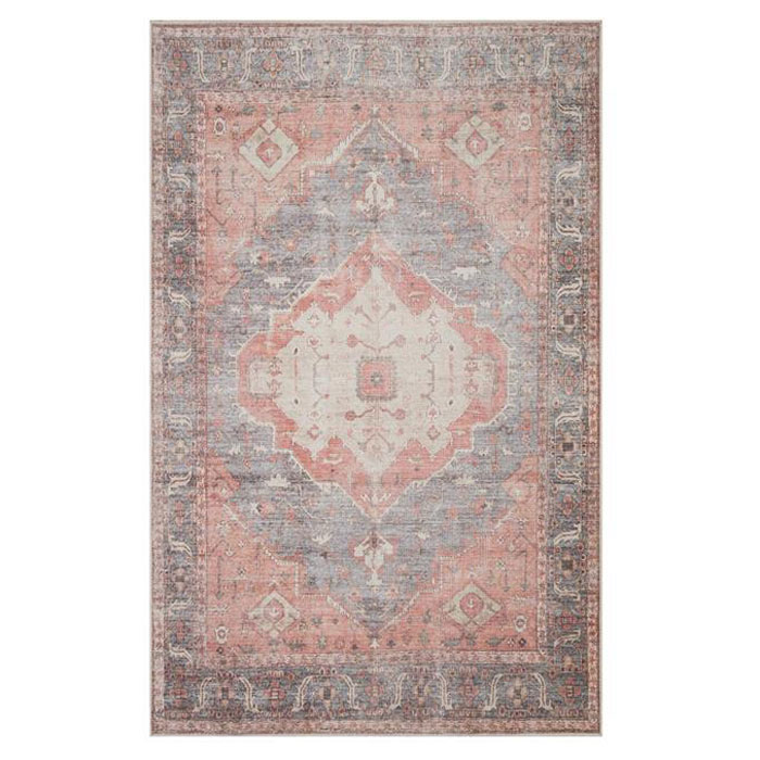Exklusiv chenille-matta från KM Carpets med ett orientaliskt inspirerat mönster som pryds av en medaljong i flera färger. Mattan har en dov, röd bottenfärg som pryds av en ljusblå medaljong i mitten. Mattan har en cremefärgad grund som kompletteras av klarröda och mjukt blå nyanser. Runt mattan löper en detaljrik bård med matchande färgskala.