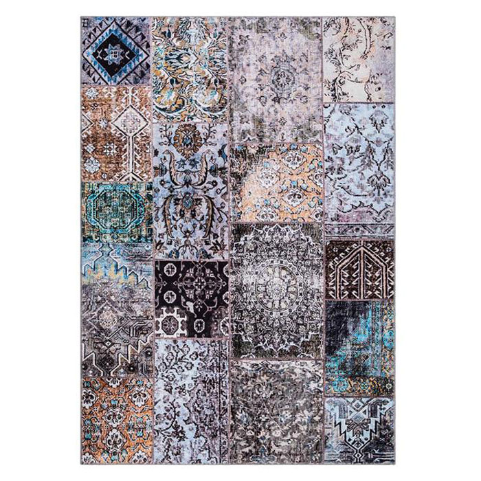 Vacker chenille-matta i naturnära färger från KM Carpets, med ett snyggt sammansatt mönster av rutor där ingen är den andra lik. En bred variation av mönster fyller varje fält och ger mattan ett lapptäckes-utseende.