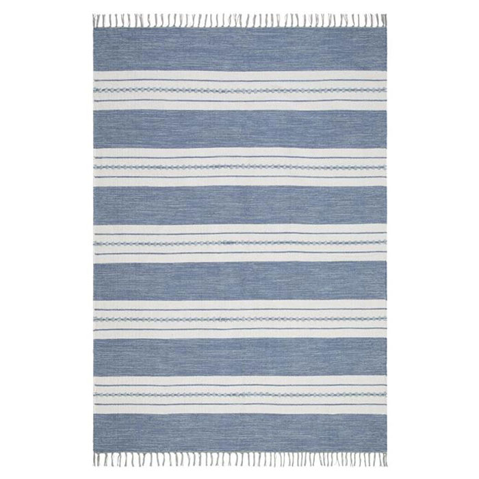 Klassisk, randig bomullsmatta med fransar från KM Carpets, som med sin härliga färg och enkla mönster gör sig lika bra i det moderna hemmet som i en sommarstuga vid skogsbrynet.