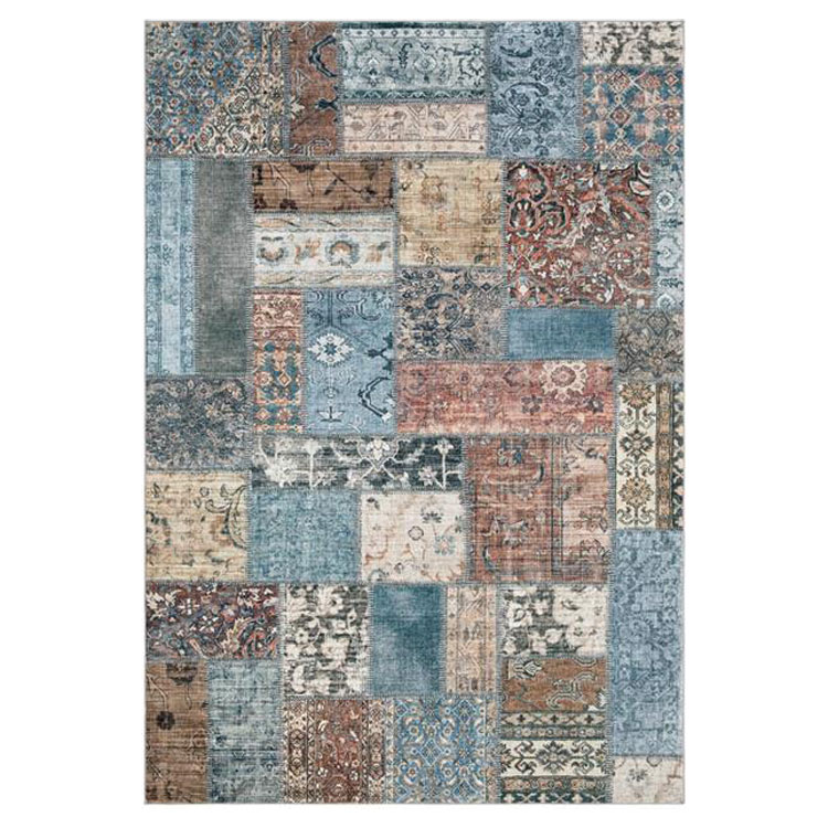 Tarfaya Patch från K/M Carpets, härligt charmig matta med tryckt lappmönster i trendiga och vackra dova färgnyanser av blått, grått, nougat och rött.