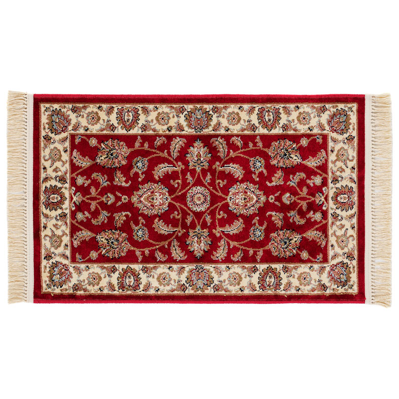Teheran Bidjar från KM Carpets, lyxig premiummatta i viskoslook med rubinröd bottenfärg. Det detaljrika mönstret av slingrande blommor och blad har inslag av turkos, sammetsblå, creme och ljusare röd. Detta ramas in av en mönstrad bård med cremefärgad botten och en snygg cremefärgad frans på kortsidorna.