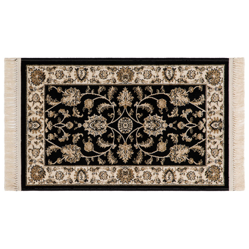 Teheran Bidjar från KM Carpets, lyxig premiummatta i viskoslook med svart bottenfärg. Det detaljrika mönstret av slingrande blommor och blad har inslag av creme och guldbrunt. Detta ramas in av en mönstrad bård med cremefärgad botten och en snygg cremefärgad frans på kortsidorna.