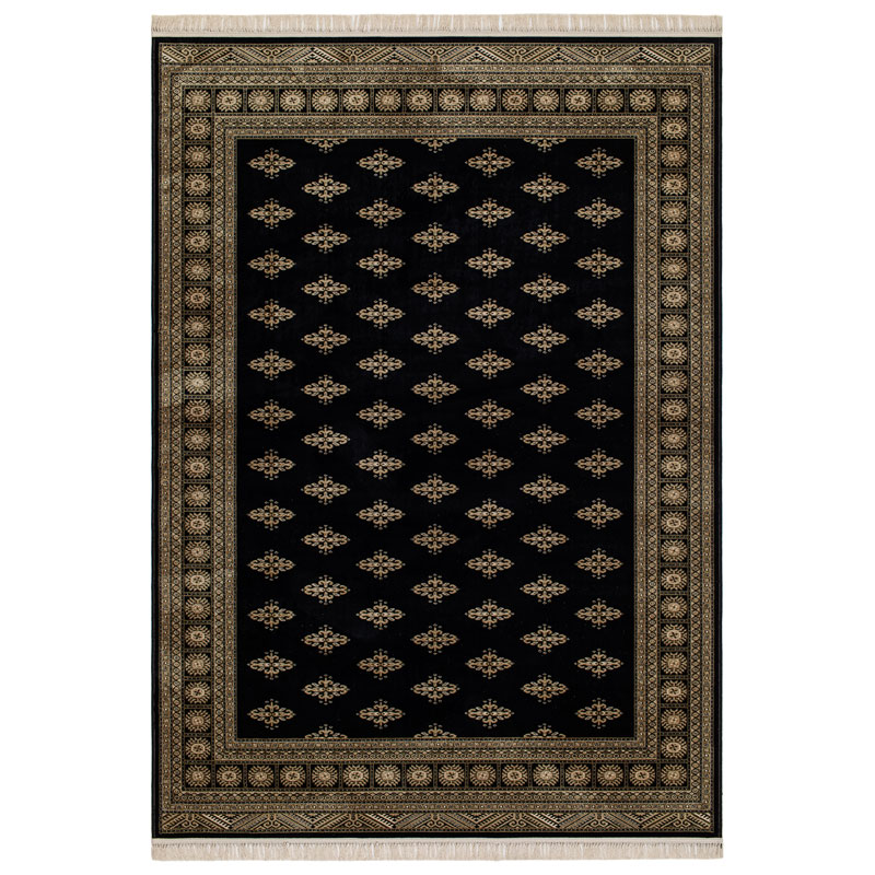 Teheran Lahori från KM Carpets, lyxig premiummatta i viskoslook med svart bottenfärg. Det vackra orientaliska mönstret har inslag av creme och guldbrun. Mattan avslutas med en snygg cremefärgad frans på kortsidorna.