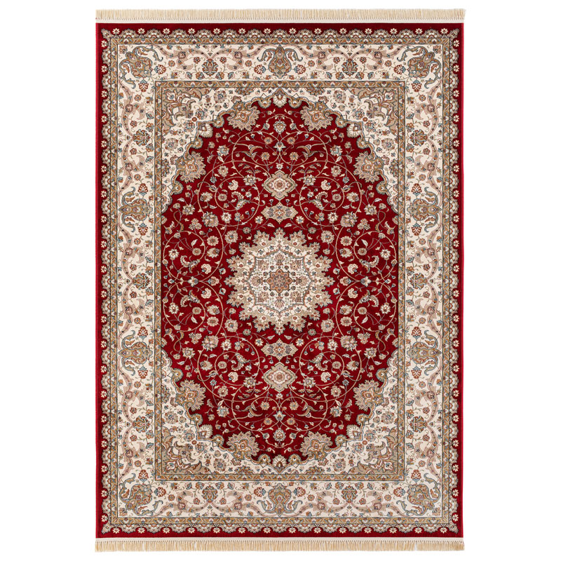 Teheran Medallion från KM Carpets, lyxig premiummatta i viskoslook med rubinröd botten. Det vackra orientaliska medaljongmönstret har inslag av creme, gyllene beige och turkos. Mattan avslutas med en snygg cremefärgad frans på kortsidorna.