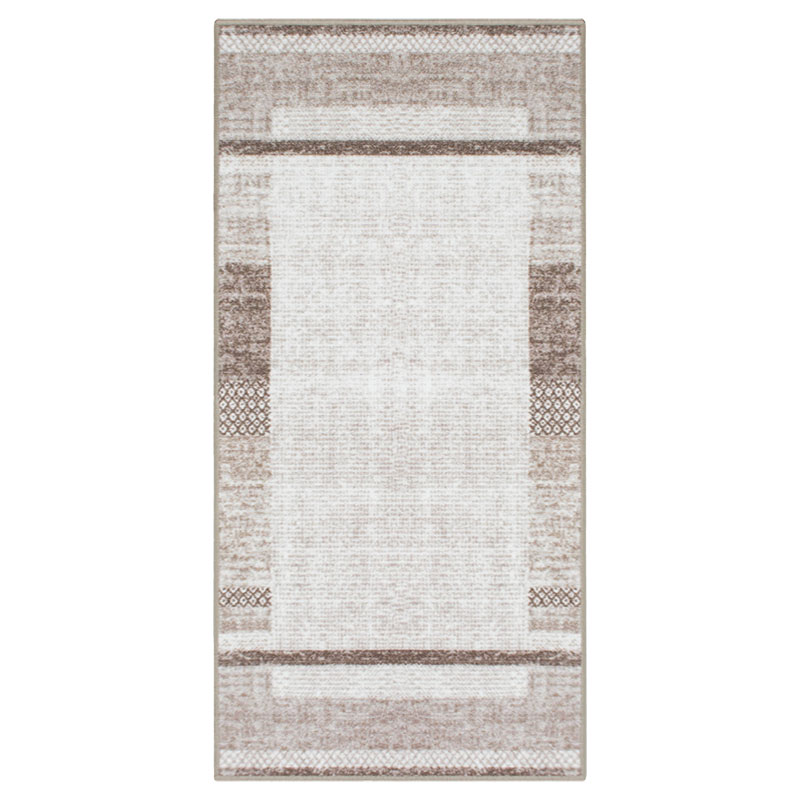 Sandfärgad matta med gummerad baksida från KM Carpets. Mattan har ett melerat mönster och langett runtom.