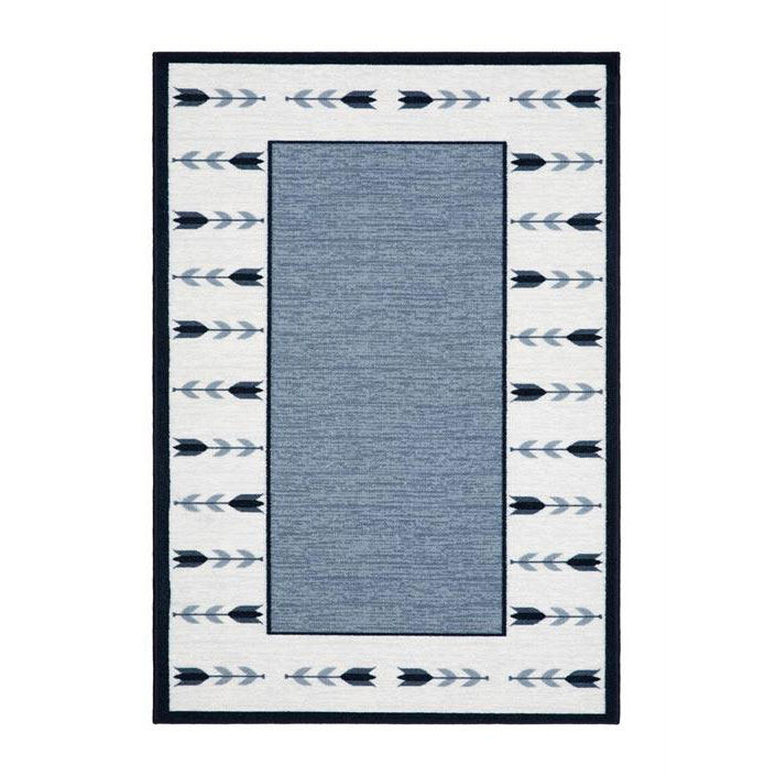 Tulpan från KM Carpets, fin flatvävd matta med melerad denimblå mitt och cremefärgad kantbård med tulpanmönster. Mattan har langett runtom och baksida i latex som gör att den ligger bra på golvet.