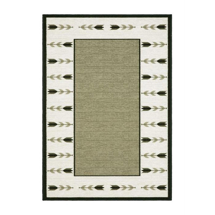 Tulpan från KM Carpets, fin flatvävd matta med melerad ljusgrön mitt och cremefärgad kantbård med tulpanmönster. Mattan har langett runtom och baksida i latex som gör att den ligger bra på golvet.