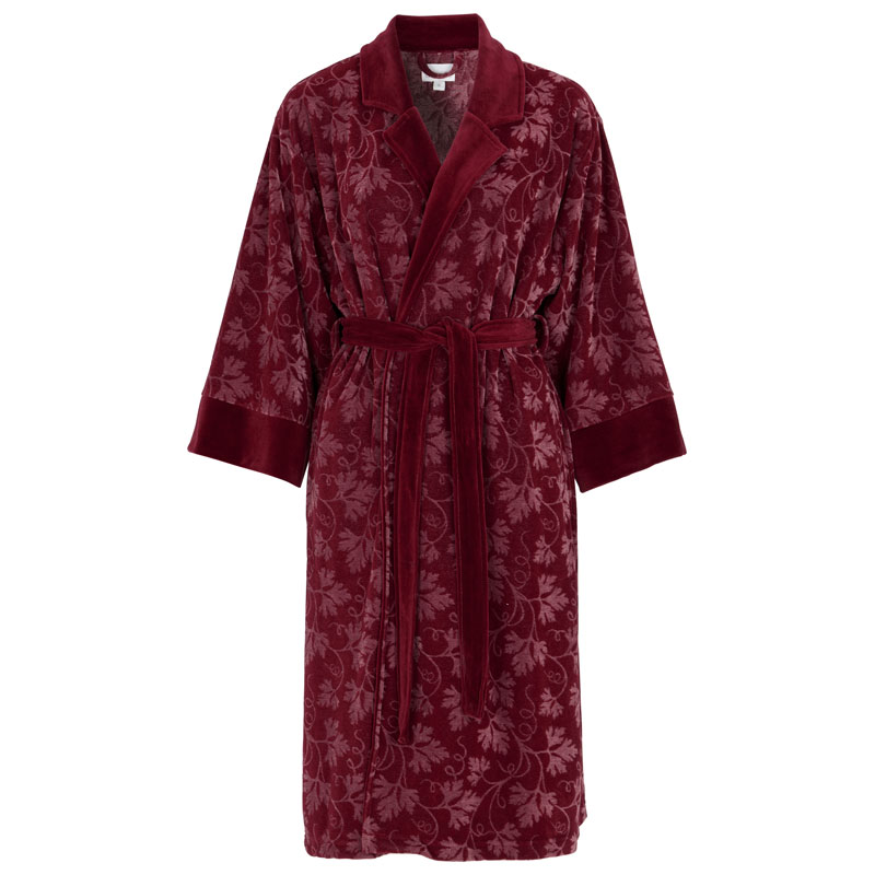 Snygg morgonrock i omlottmodell från Damella of Sweden. Med ett vackert mönster, sjalkrage, långa ärmar och fickor i sidsömmarna. Tillverkad i ton-i-ton jacquardvelour med muddar i slät velour.