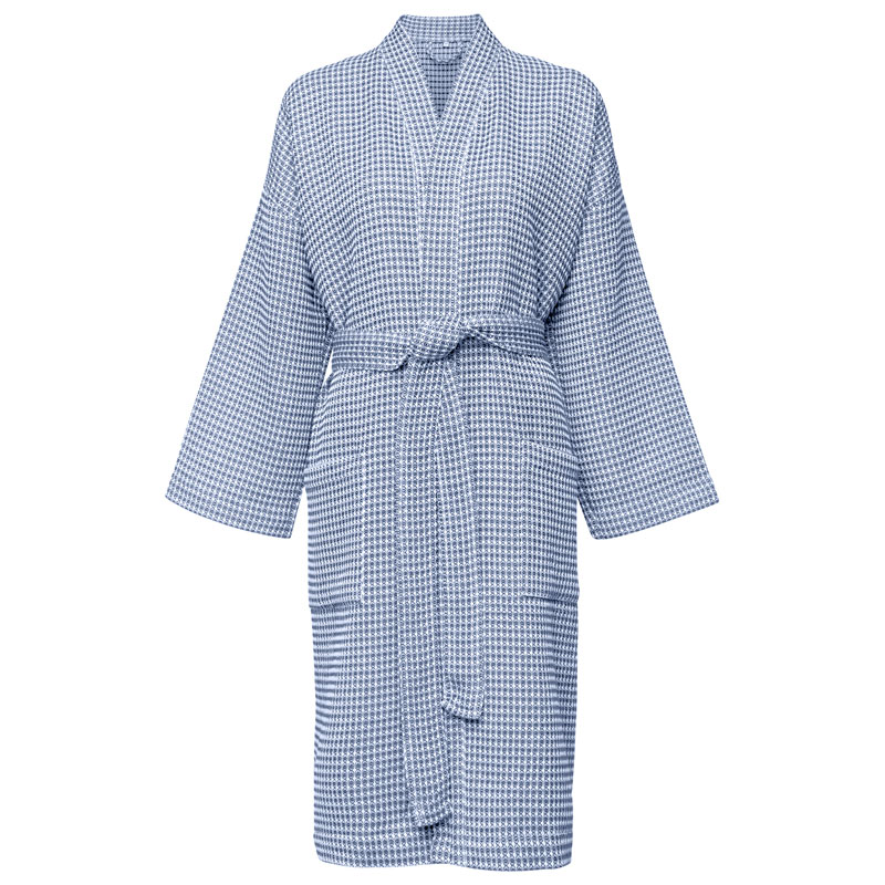 Wilma Badrock från Recycled by Wille, våfflad badrock i gråblått. Den har två praktiska fickor framtill och ett knytband runt midjan.