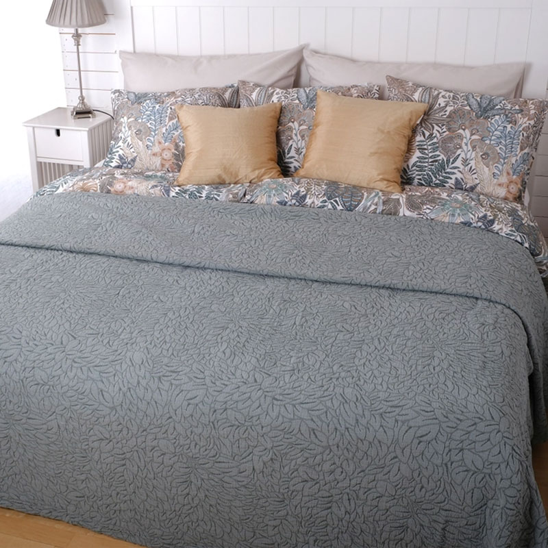 Jonna från Värnamo of Sweden är ett vackert överkast i en fin grön nyans med strukturvävt, bladinspirerat mönster. Det har en stentvättad yta som skapar mjukhet och ett levande intryck.