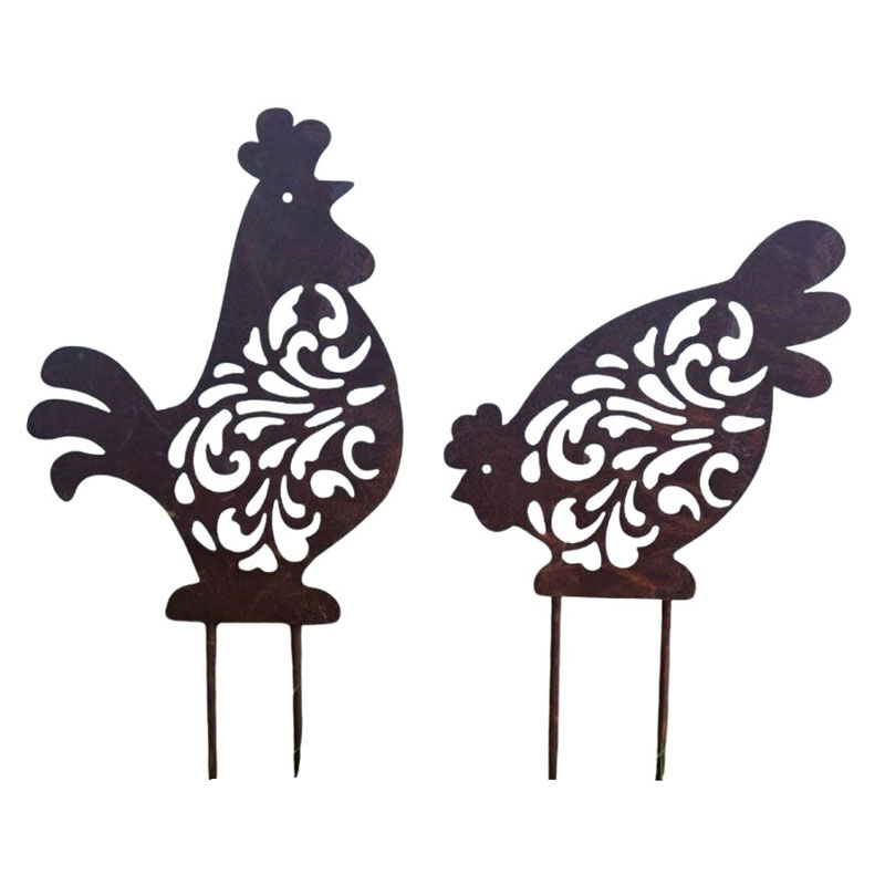 Vackert mönstrade trädgårdsdekorationer från Lind Decoration som säljs i 2-set i form av en tupp och en höna.