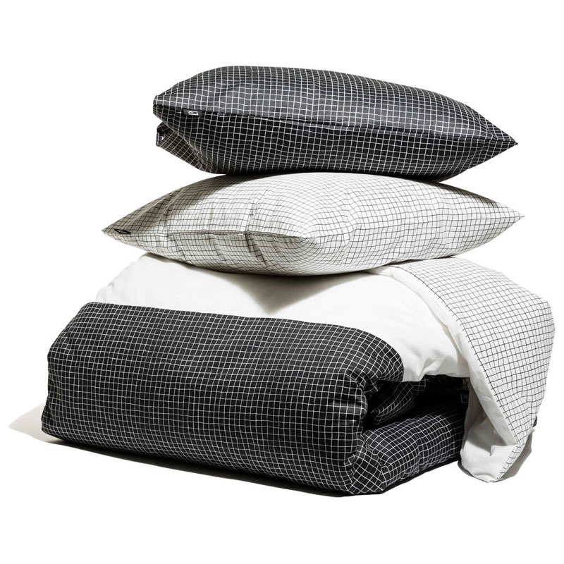 Stilrent påslakan i grått och vitt som ger en lugn känsla i sovrummet.