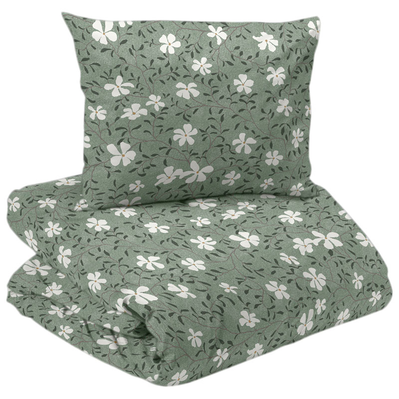 Hedvig är ett charmigt påslakanset från Redlunds, prydd av ett iögonfallande blommönster i vitt mot en grön botten.