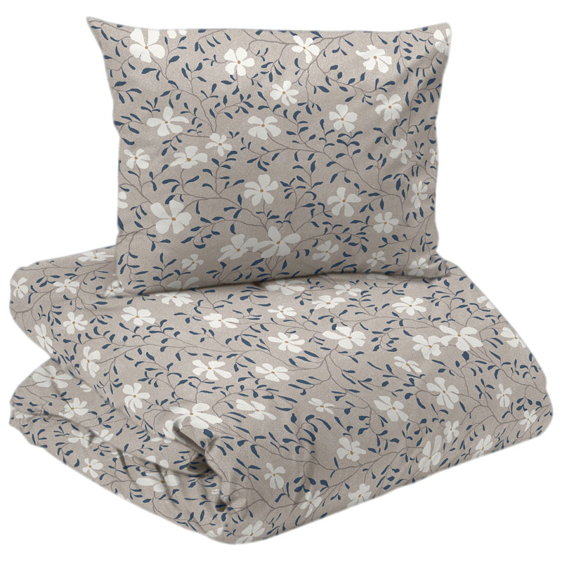 Hedvig är ett charmigt påslakanset från Redlunds, prydd av ett iögonfallande blommönster i vitt och blått mot en linnefärgad botten.