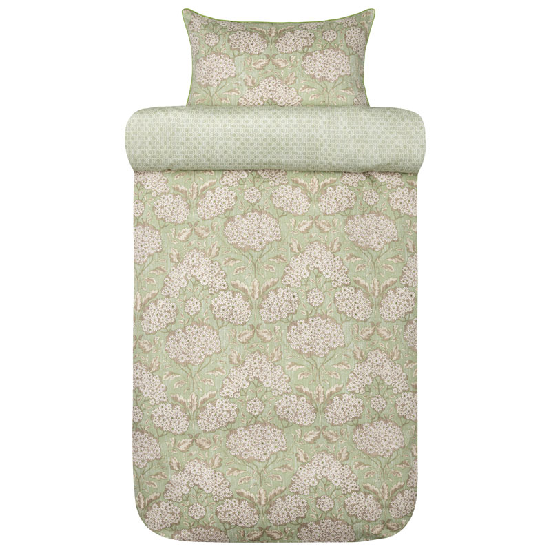 Karette är ett underbart påslakanset i mjuk och slät bomullssatin från Høie, med ett elegant blommönster i lugna, gröna toner. Det har en vändbar design som gör att du själv kan välja vilket mönster som ska pryda sängen.