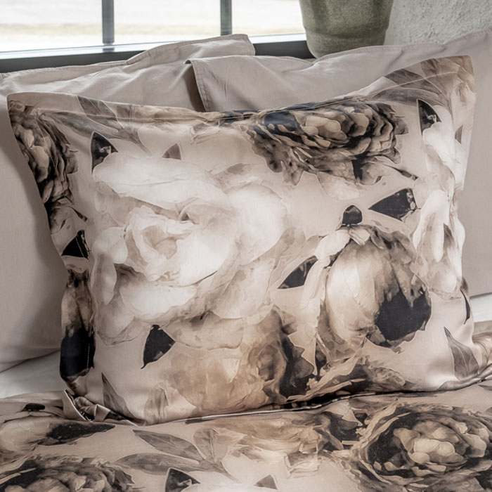Opal från HT Design, digitaltryckt påslakanset av satin i beige med vackert blommotiv i vita/bruna nyanser.