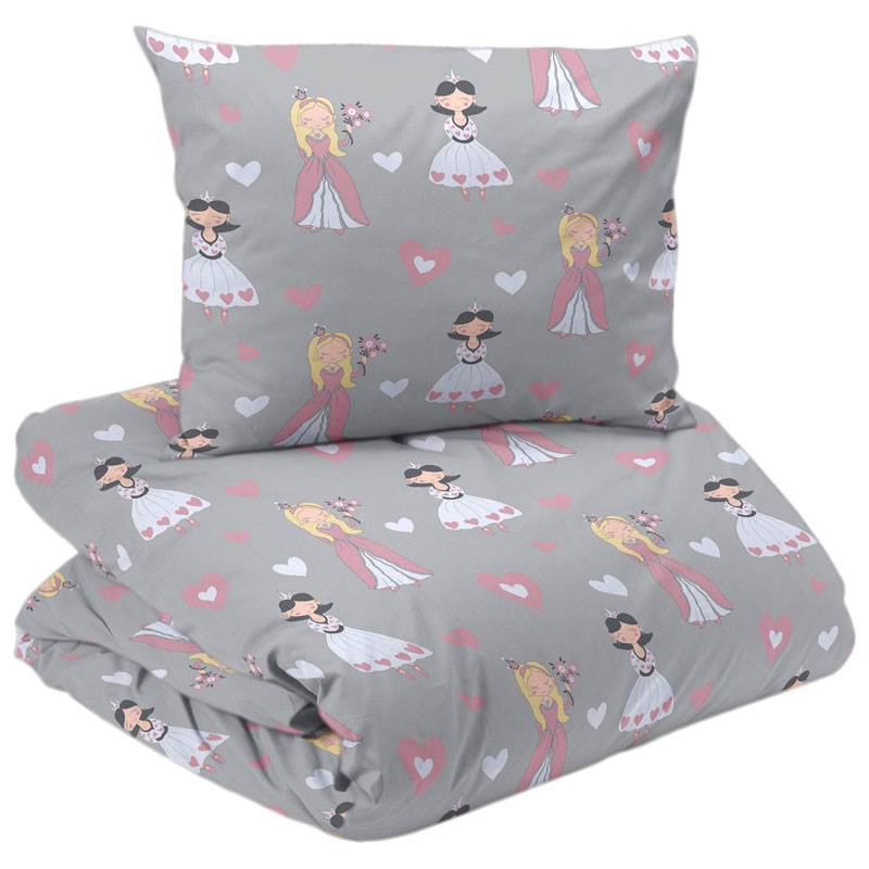 Prinsessa är ett gulligt påslakanset från Redlunds, med ett mönster av rosa och vita hjärtan, och prinsessor i vackra klänningar.