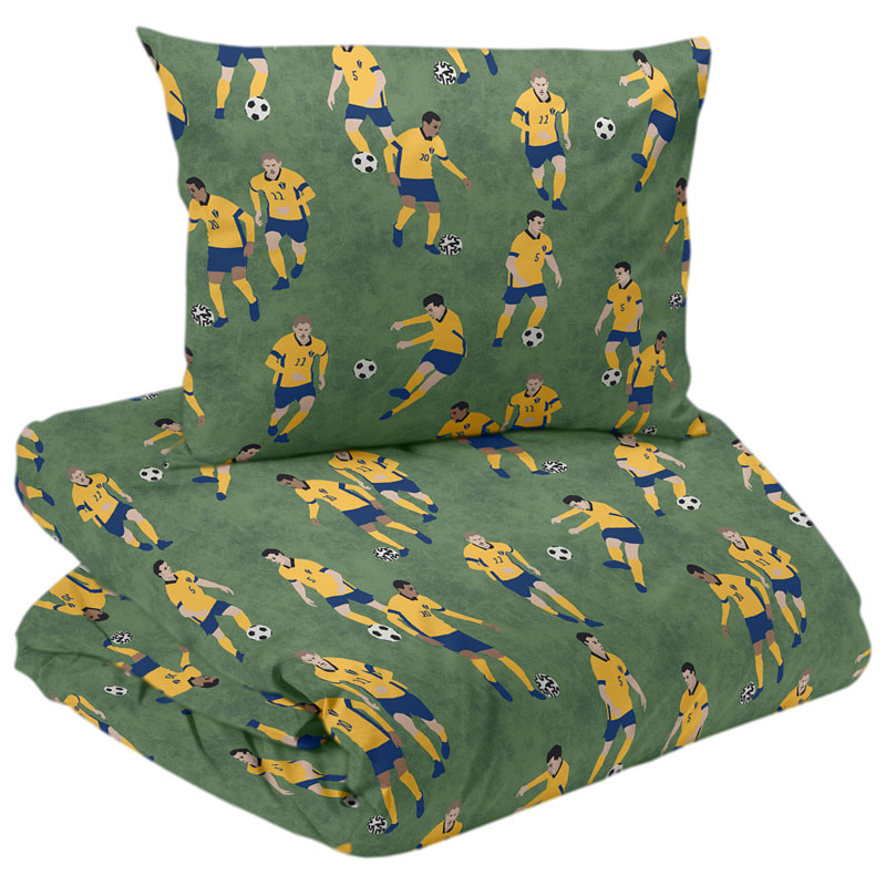 Soccer är ett häftigt påslakanset från Redlunds, med ett mönster av svenska fotbollsspelare ute på planen.