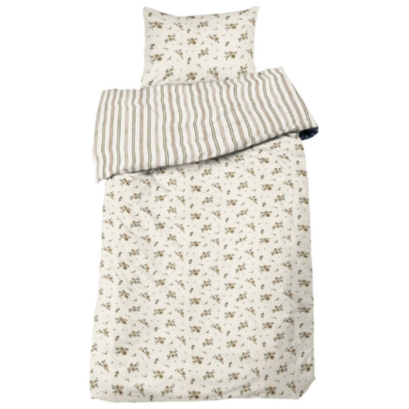 Vackert påslakanset i bäckebölja, med två olika mönster från Redlunds. Ena sidan är blommig med en vit botten och den andra sidan är randig med små blommig detaljer för att matcha.