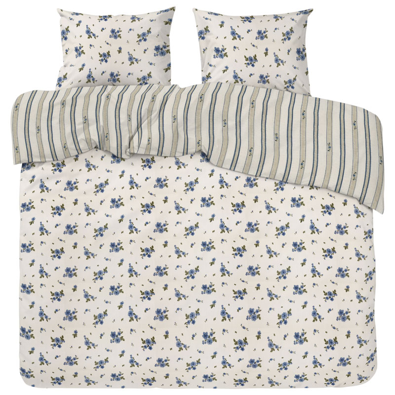 Vackert påslakanset i bäckebölja, med två olika mönster från Redlunds. Ena sidan är blommig med en vit botten och den andra sidan är randig med små blommig detaljer för att matcha.