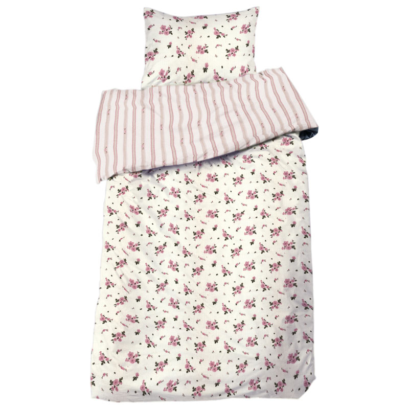 Vackert påslakanset i bäckebölja, med två olika mönster från Redlunds. Ena sidan är blommig med en vit botten och den andra sidan är randig med små blommig detaljer för att matcha.
