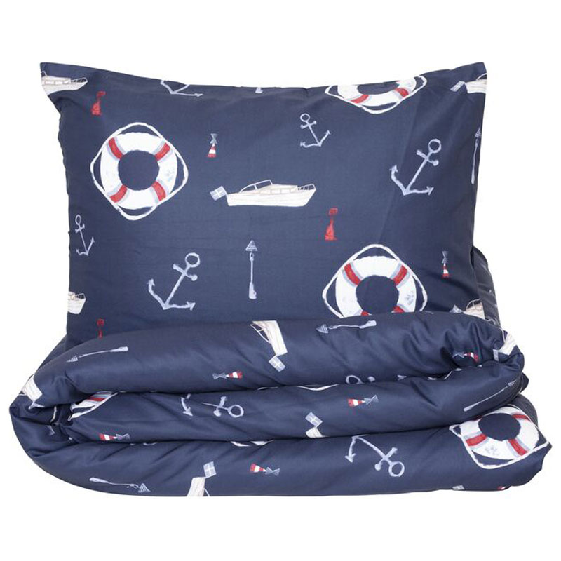 På påslakansettet hittar du bojar, ankare, båtar och sjömärken på marinblå botten.