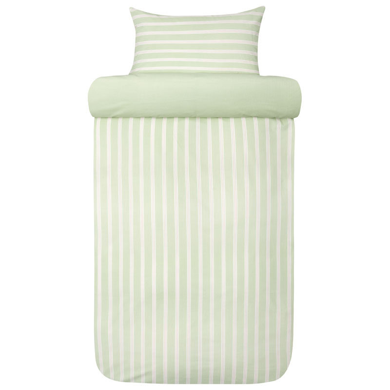 Den milda, vårgröna färgen ger rummet ett friskt och balanserat uttryck, medan de smala ränderna skapar en ren och klassisk design som passar i alla hem. Baksidan är enfärgad i grönt.