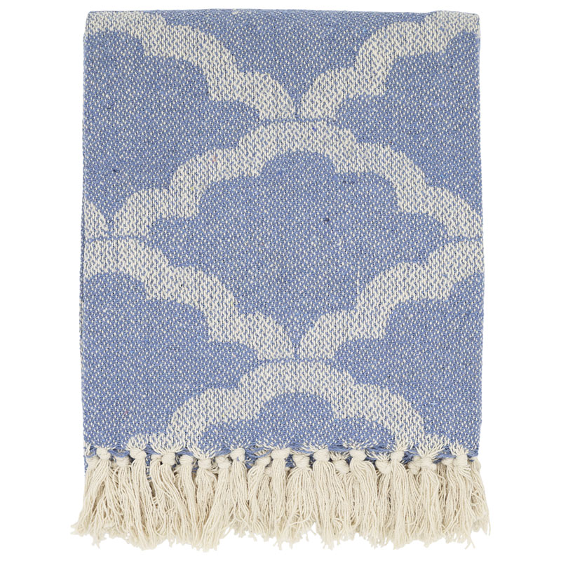 Prydd av ett härligt geometriskt mönster i vitt mot en blå botten, plädens nedre kant pryds av tofsar som snyggt ramar in dess mönster.