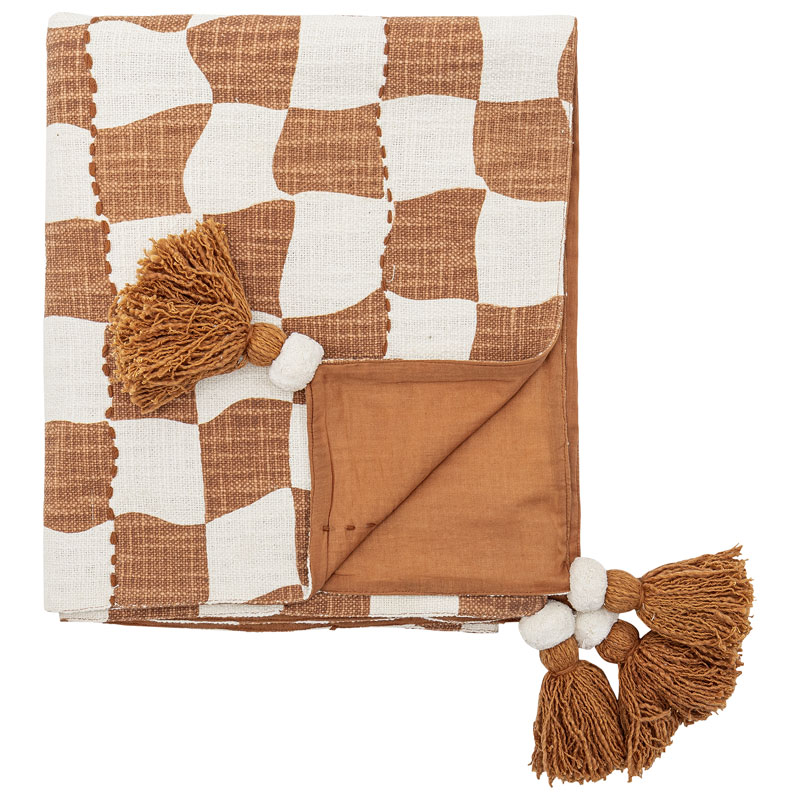 Prydd av ett grafiskt rutmönster i brunt/orange och vitt.