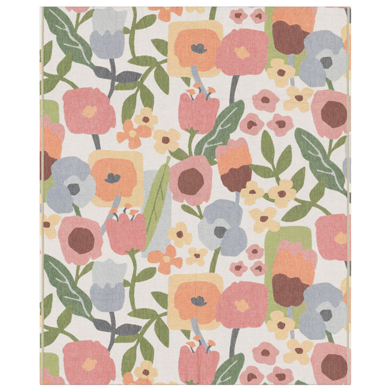 Juni är en vacker pläd från Ekelund, med motiv av olikfärgade blommor mot en vit botten.