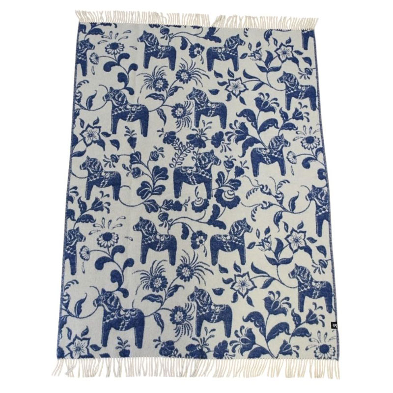 Lyxig ullpläd från Arvidssons textil med traditionellt motiv av dalahästar och kurbits, och fina, vita fransar på kortsidorna.