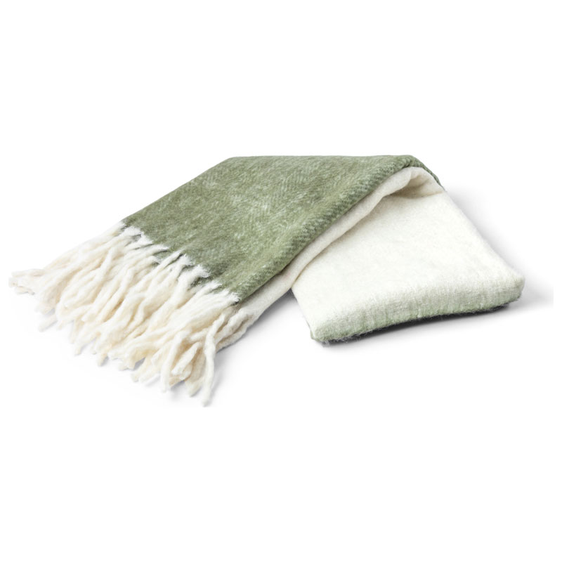 Malin Ullpläd från Kosta Linnewäfveri, underbar varm ullpläd i färgerna ljusgrönt och offwhite. Pläden har fransar längs kortsidorna.
