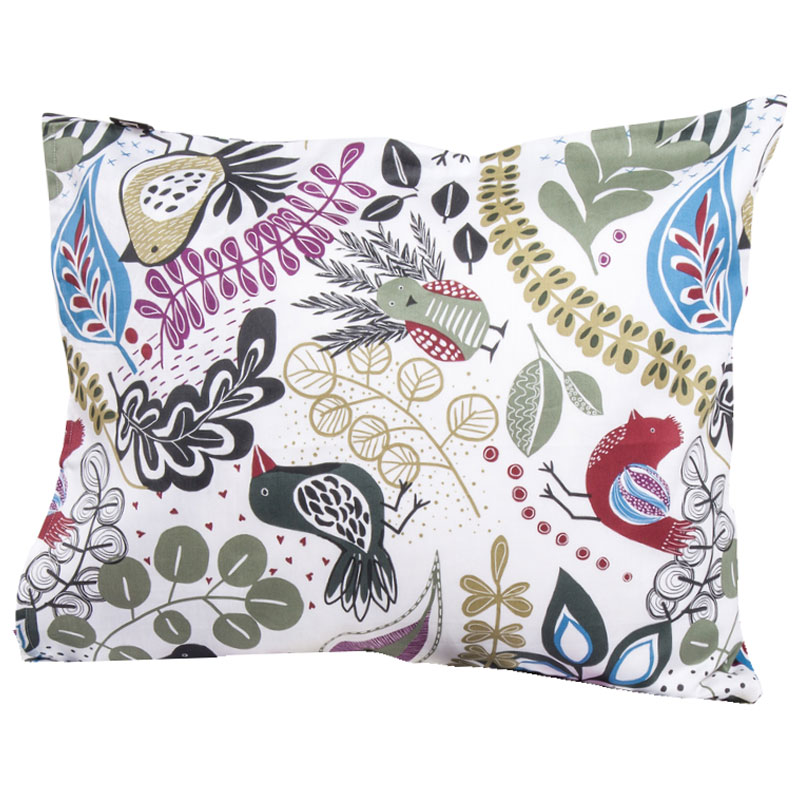 Lekfullt, mönstrat örngott i satin från Kosta Linnewäfveri med en vit botten och flerfärgat mönster.