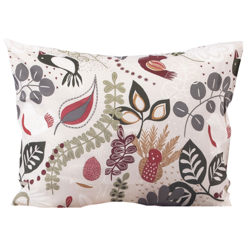 Lekfullt, mönstrat örngott i satin från Kosta Linnewäfveri med en sandfärgad botten och flerfärgat mönster.