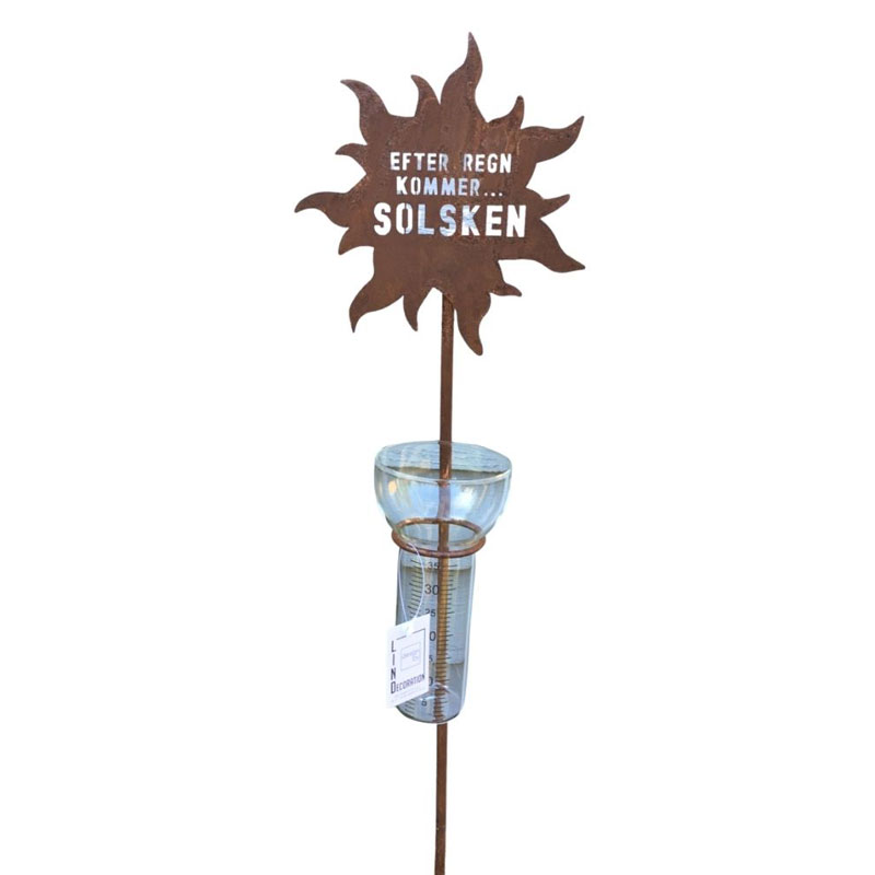 Vacker regnmätare från Lind Decoration med en sol högst upp med den utstansade texten "Efter regn kommer... solsken".