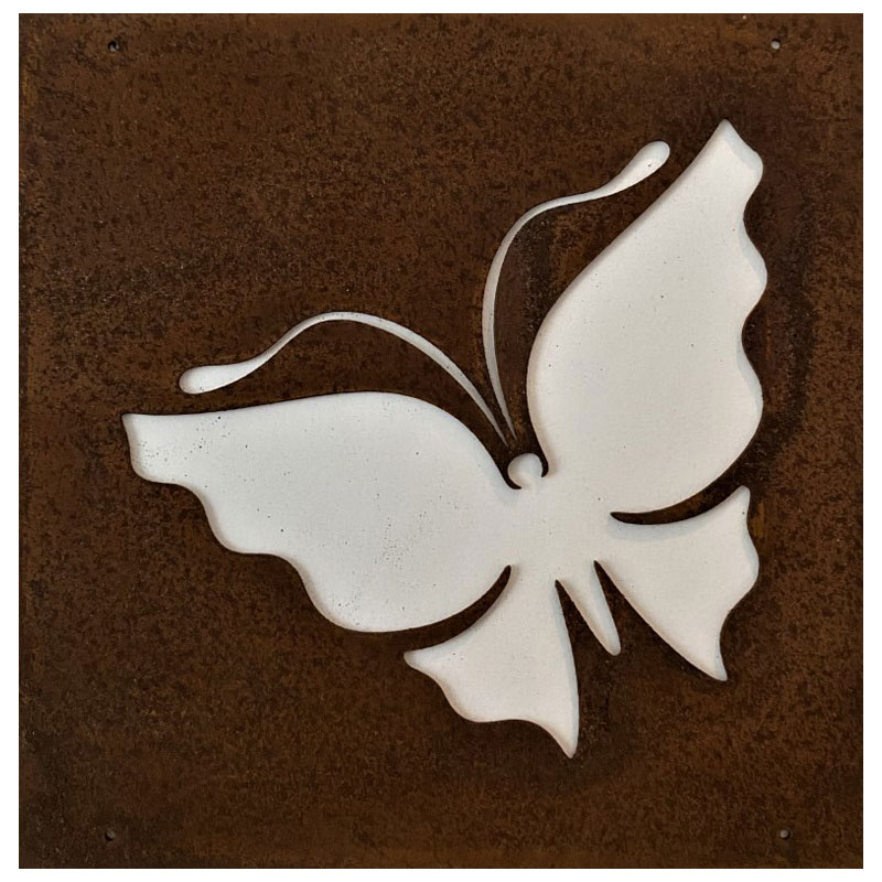 Fin skylt till armeringsnät från Lind Decoration, med utstansat motiv av en fjäril.