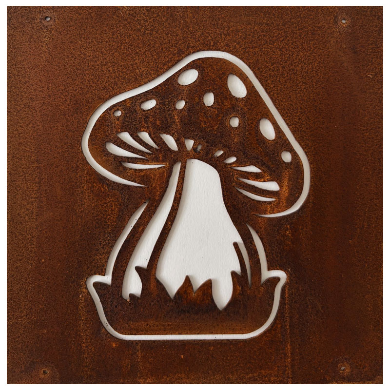 Fin skylt till armeringsnät från Lind Decoration, med utstansat motiv av en flugsvamp.