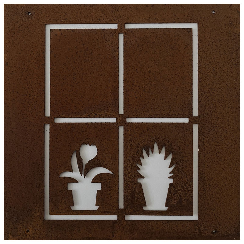 Fin skylt till armeringsnät från Lind Decoration, med utstansat motiv av ett fönster med två krukväxter.