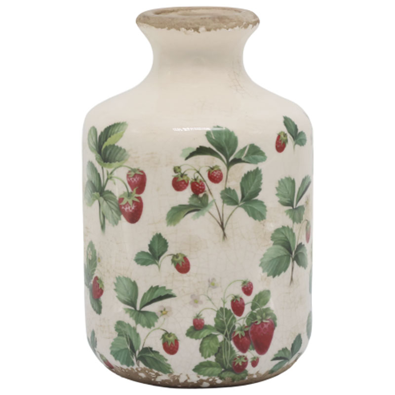 Gullig flaska från Chic Antique, prydd av småmönstrade jordgubbar mot en offwhite botten.