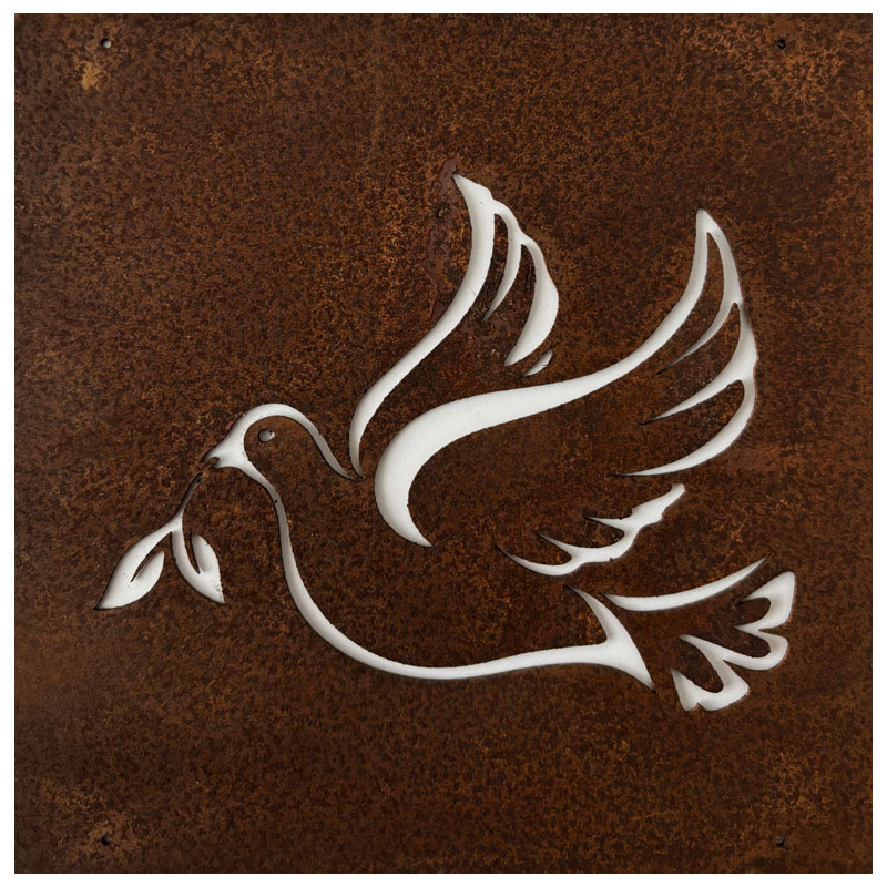 Fin skylt till armeringsnät från Lind Decoration, med utstansat motiv av en fredsduva.