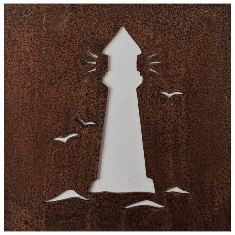 Fin skylt till armeringsnät från Lind Decoration, med utstansat motiv av en fyr.
