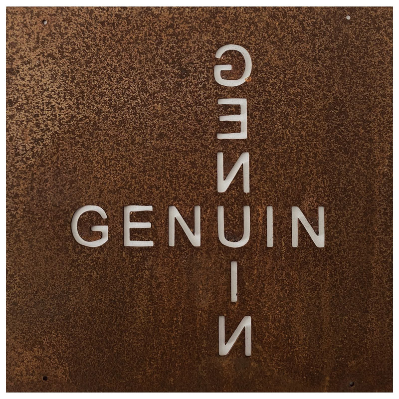 Fin skylt till armeringsnät från Lind Decoration, med ordet "Genuin" utstansat både lodrätt och vågrätt.