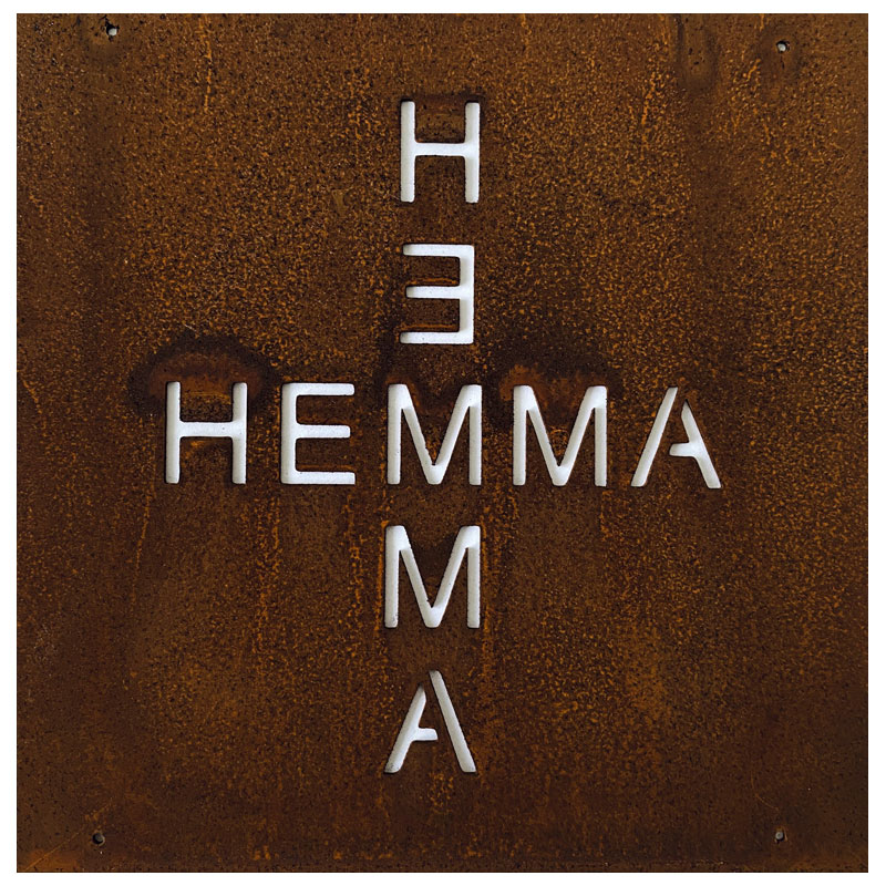 Fin skylt till armeringsnät från Lind Decoration, med ordet "Hemma" utstansat både lodrätt och vågrätt.
