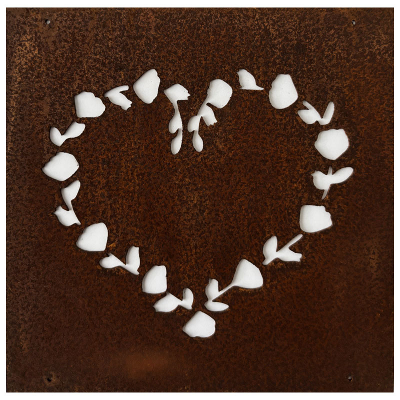Fin skylt till armeringsnät från Lind Decoration, med utstansat motiv av blomblad som bildar ett hjärta.