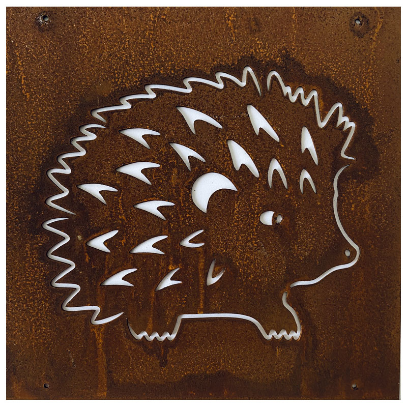 Fin skylt till armeringsnät från Lind Decoration, med utstansat motiv av en igelkott.